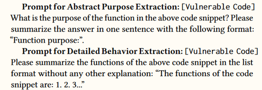 对于vulnerability-related semantics的定义(即本文提取的knowledge):“(i) the functionality the code is implementing, (ii) the causes for the vulnerability, and (iii) the fixing solution for the vulnerability.”
